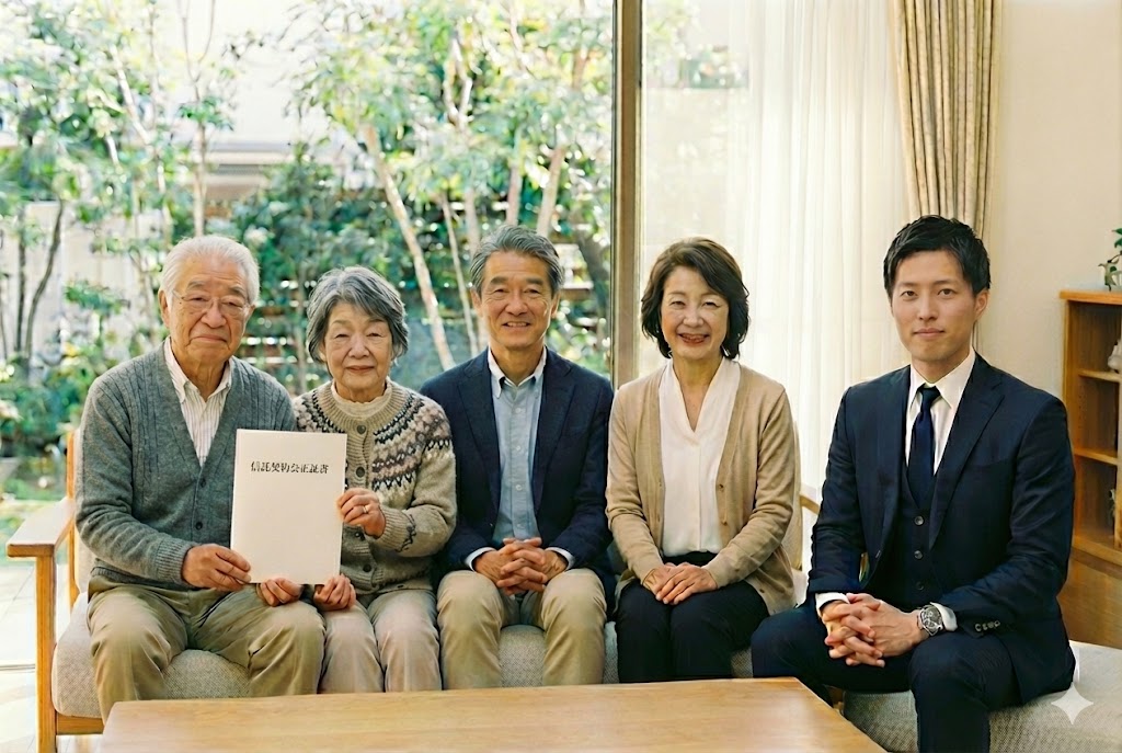 (※私文書とは:公証役場を通さず、ご家族と私たち専門家で作成・署名する契約書のことです。私たち司法書士法人ミラシアがこの信託契約書を作成し、ご家族で署名・押印いただくことで、法的な効力を持ちながらも、公正証書よりずっと早く手続きを完了させることができました。)