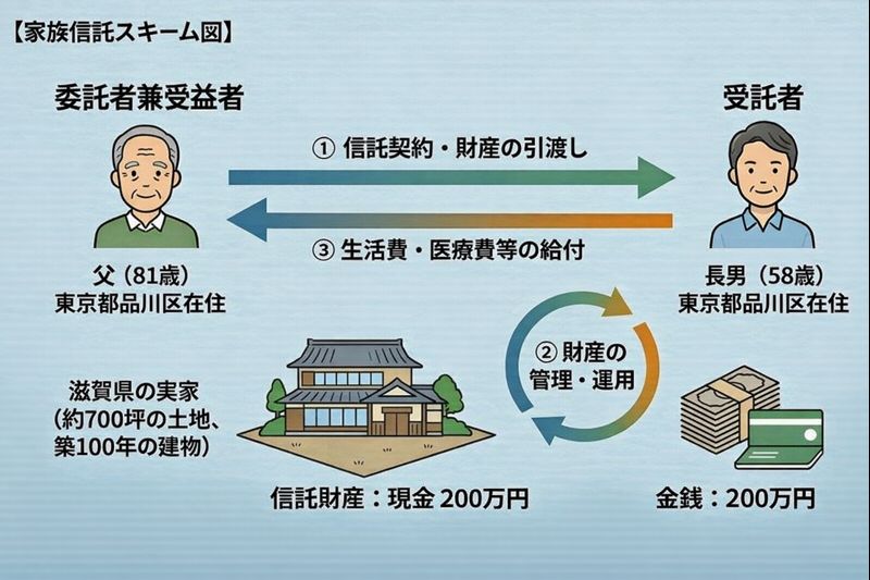 ◆信託財産 | (不動産)滋賀県の実家(約700坪の土地、築100年の建物) (金銭)200万円 |