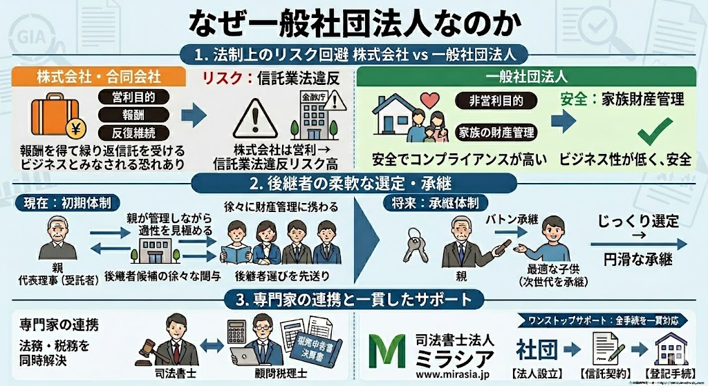 複雑な法制上のリスクを回避する緻密な設計 ここで非常に重要になるのが、「株式会社や合同会社ではなく、なぜ一般社団法人を設立するのか」という点です。