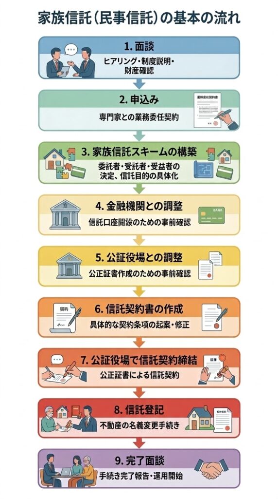 お母様からは、「娘たちに迷惑をかけたくない」「自分のマンションを売ったお金で、一番良い施設に入りたい」という、非常に明確で強いなご意思を伺うことができました。私たちは、自分の代わりに次女にマンションの管理と売却を任せるという家族信託の仕組みを分かりやすく説明し、お母様がその内容を十分にご理解されていることを専門家として慎重に確認しました。このプロセスこそが、後に公証役場で手続きをスムーズに進めるための重要な土台となります。
