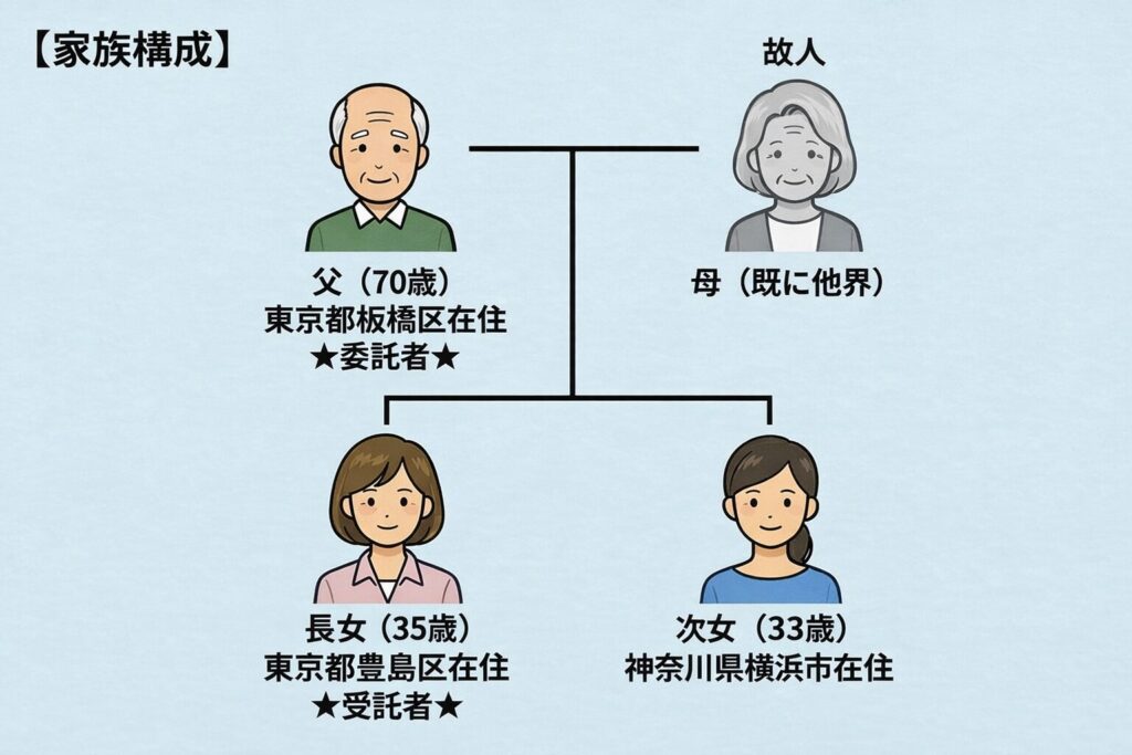 本件では、長女が東京都豊島区、次女が神奈川県横浜市にお住まいで、お二人ともお父様を気にかけながら支えておられました。その中で、誰が中心となって実務を担うかを明確にしておくことも重要でした。ご家族で話し合った結果、主として長女が窓口となって動いており、今後も継続的に手続きを担いやすいことから、長女を受託者とする方向で検討が進みました。