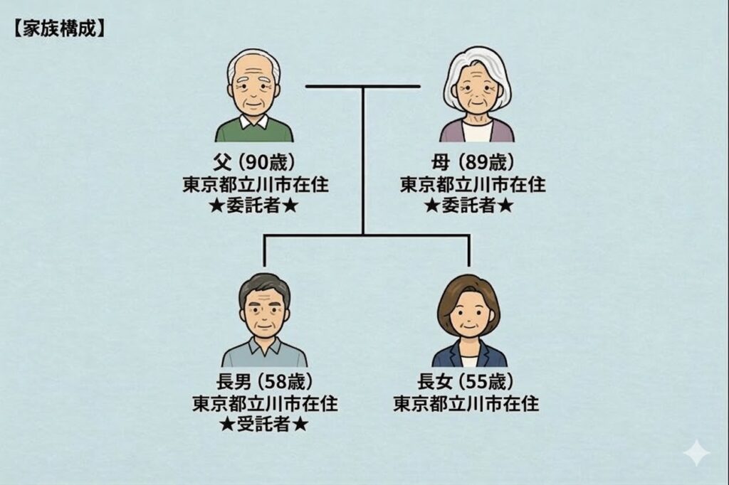 ◆ご家族 | 父(90歳)=東京都立川市在住 ★委託者★ 母(89歳)=東京都立川市在住 ★委託者★ 長男(58歳)=東京都立川市在住 ★受託者★ 長女(55歳)=東京都立川市在住 |