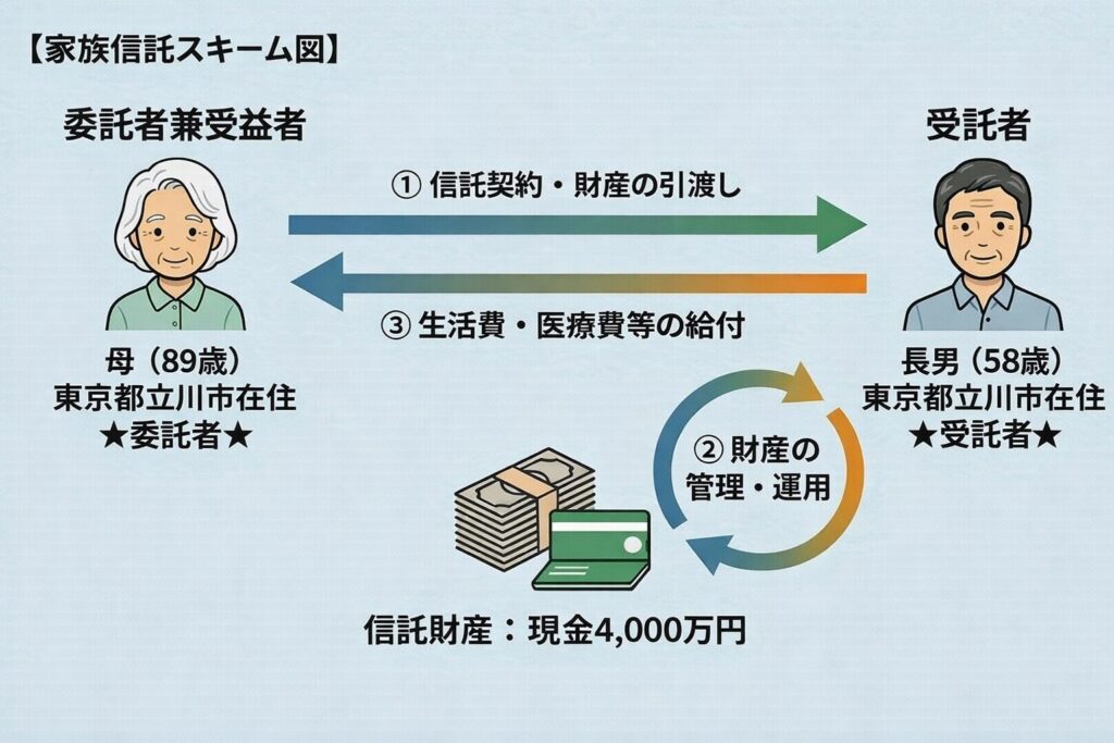 一方で、金銭については別です。ご夫婦ともご高齢であり、今後、介護費用、生活費、医療費、施設関連費用などの支払いが継続的に発生する可能性があります。預貯金が凍結状態に近づくと、ご家族の日常の実務負担は一気に重くなります。そこで、父6,000万円、母5,000万円については、それぞれ金銭のみを家族信託の対象とし、長男様が受託者として管理できる体制を整えることにしました。